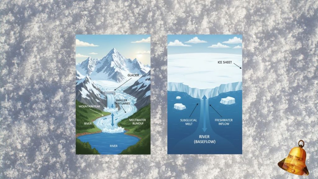 Di daerah kutub atau pegunungan tinggi, gletser dan lapisan es menjadi cadangan air raksasa. Saat mencair, airnya mengalir ke sungai dan danau. Proses ini sangat penting, terutama di negara-negara yang bergantung pada salju sebagai sumber air.