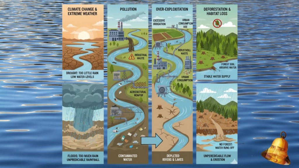 Selain itu, polusi dari limbah industri, pertanian, maupun rumah tangga sering mencemari sungai dan danau, sehingga sulit dimanfaatkan sebagai sumber air bersih. Tantangan lain adalah over-eksploitasi, di mana penggunaan air berlebihan untuk pertanian atau industri dapat menyebabkan sungai dan danau mengering. Ditambah lagi, hilangnya hutan sebagai penyimpan air alami membuat air hujan langsung mengalir ke sungai tanpa sempat terserap tanah, sehingga ketersediaan air permukaan menjadi tidak stabil.