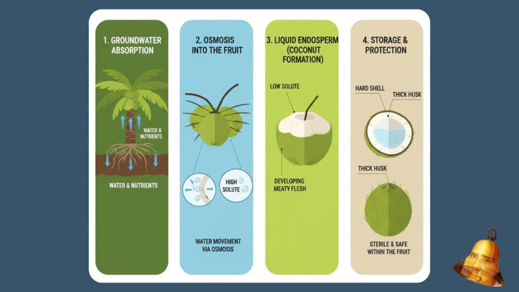 Coconut water isn't just a refreshing drink, but the result of a remarkable biological process . From the roots' absorption of groundwater, through osmosis, to the formation of the liquid endosperm within the fruit, everything occurs naturally without human intervention.