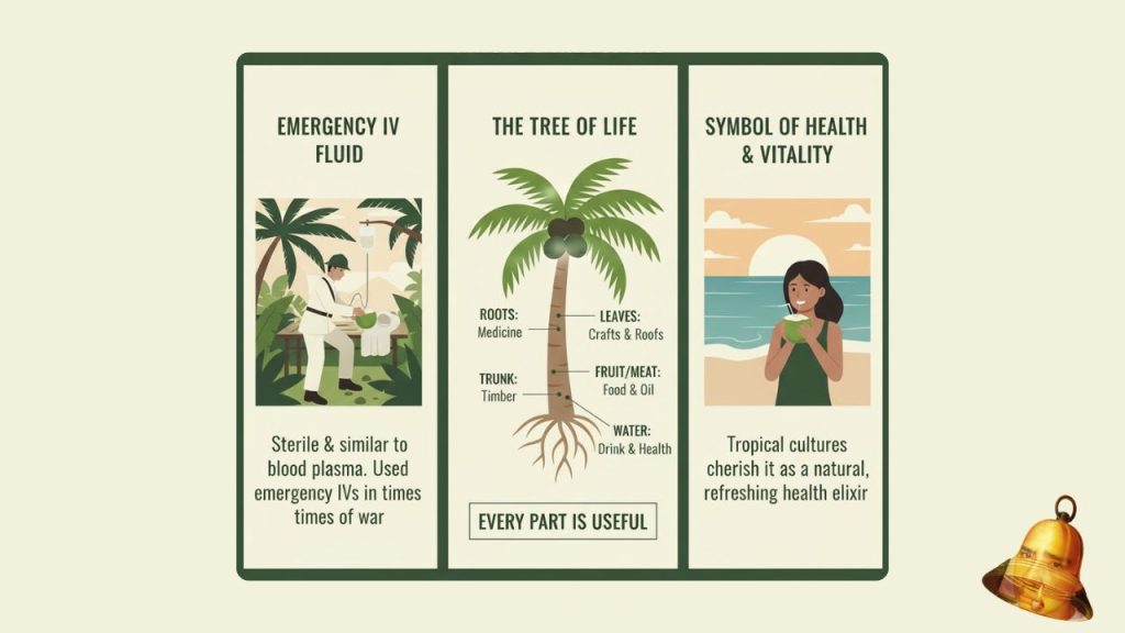 Coconut water was once used as an emergency IV fluid during wartime due to its sterile properties, similar to blood plasma. It's no wonder the coconut tree is often called the "tree of life," as almost every part of it is beneficial, from the roots and trunk to the leaves and fruit to the water. In many tropical cultures, coconut water is even considered a symbol of natural freshness and health, inherited directly from nature.