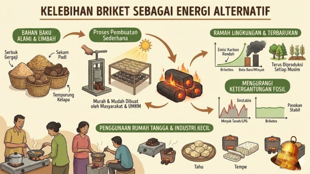 Briket memiliki banyak kelebihan sebagai energi alternatif. Selain ramah lingkungan karena berasal dari bahan alami yang biasanya dianggap limbah dan menghasilkan emisi karbon lebih rendah dibandingkan batu bara atau minyak, briket juga murah serta mudah dibuat. Bahan bakunya tersedia di sekitar kita, seperti serbuk gergaji, sekam padi, atau tempurung kelapa, dan proses pembuatannya tidak membutuhkan teknologi rumit sehingga bisa dilakukan oleh masyarakat desa maupun UMKM.